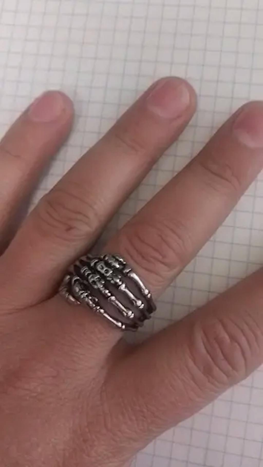 Unique design combining skull and skeletal hand gripping the finger